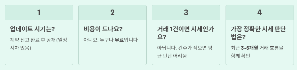 - 특수관계인 거래(가족 간 거래)는 시세 판단에 참고만 해야 합니다.