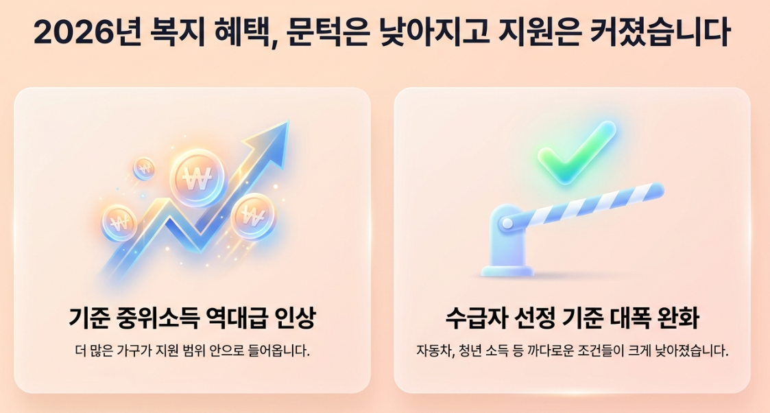 2026년 기초생활수급자 자격은 역대 최대 폭으로 인상된 중위소득과 완화된 자동차·청년 기준 덕분에 사각지대가 대폭 해소될 전망입니다. 본인의 소득인정액이 가구원 수별 급여 선정 기준(중위소득 32~50%)에 부합하는지 주민센터나 복지로를 통해 꼭 확인해 보세요.