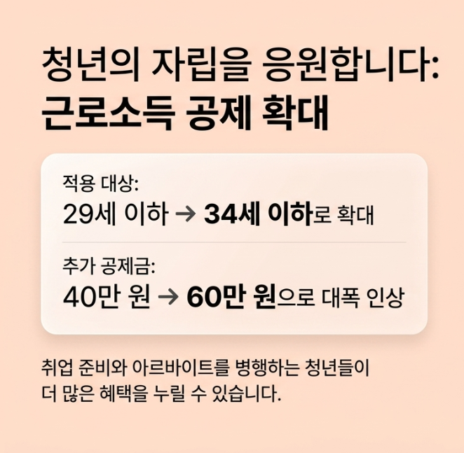 취업을 준비하거나 아르바이트를 하는 청년들에게도 기쁜 소식입니다. 정부는 청년들이 일하면서 자립할 수 있도록 근로·사업소득 공제를 강화했습니다. 기존 29세 이하에서 34세 이하로 적용 대상을 확대했고, 추가 공제금 또한 40만 원에서 60만 원으로 인상했습니다. 예를 들어 월 100만 원을 버는 30세 청년 민준 씨의 경우, 바뀐 기준을 적용하면 다음과 같이 소득인정액이 계산됩니다.