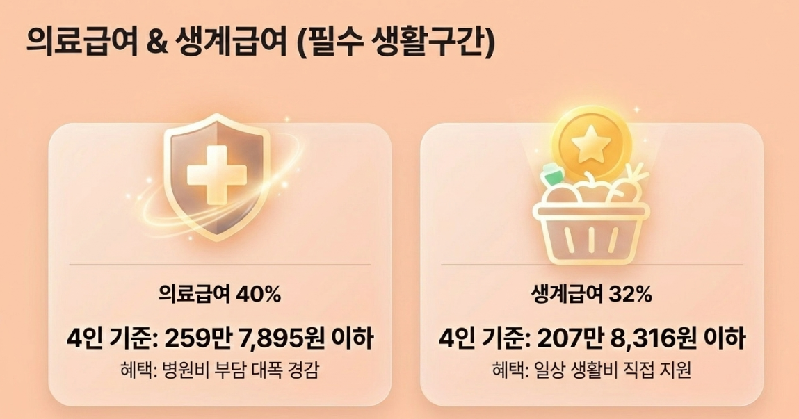 - 의료급여 (40% 이하): 병원비 부담을 덜어주며, 4인 가구 기준 259만 7,895원 이하가 대상입니다.