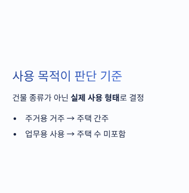 주거용으로 실제 거주하고 있다면 주택으로 간주될 수 있고, 업무용으로 사용한다면 주택 수에 포함되지 않을 수 있습니다. 단순히 건물 종류만으로 판단하지 않고, 실제 사용 형태가 중요합니다.