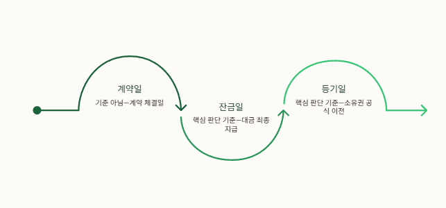 보통 잔금일이나 등기일 기준으로 판단합니다. 계약일만 보고 판단하면 위험할 수 있습니다.