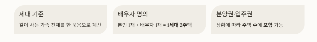 다주택 여부는 개인 기준이 아니라 세대 기준으로 계산되는 경우가 많습니다.