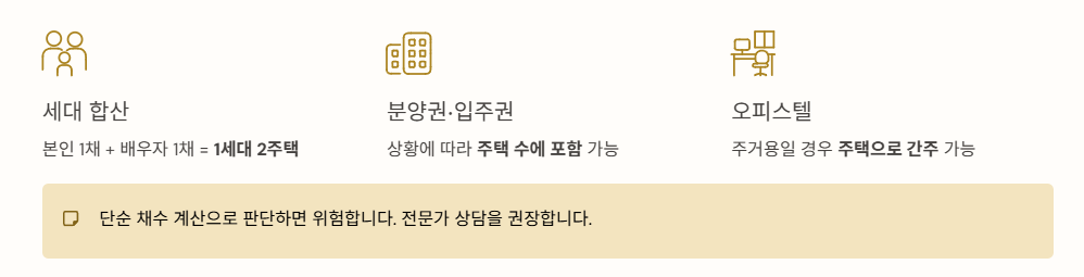 또한 분양권, 입주권, 오피스텔 등은 상황에 따라 주택 수에 포함될 수 있으므로 단순 채수 계산으로 판단하면 위험합니다.