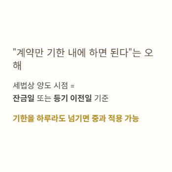 많은 사람이 “계약만 기한 내에 하면 된다”고 생각하지만, 세법상 양도 시점은 보통 잔금일 또는 등기 이전일을 기준으로 판단합니다.