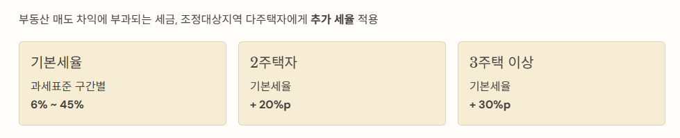 와 같이 중과세율이 추가 적용되는 구조였습니다. 이 때문에 매도 차익이 클수록 세금 부담이 급격히 증가하는 문제가 있었습니다.