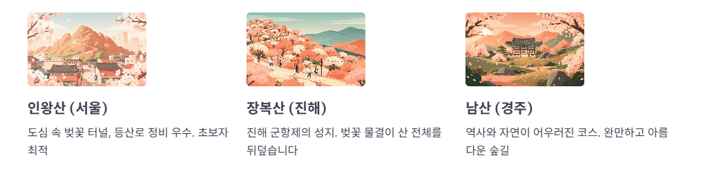 추천하는 명소로는 서울의 인왕산, 진해의 장복산, 그리고 경주의 남산 등이 있습니다. 이곳들은 등산로 정비가 잘 되어 있어 초보자들도 벚꽃 터널을 만끽하며 기분 좋게 걸을 수 있는 최적의 장소입니다.