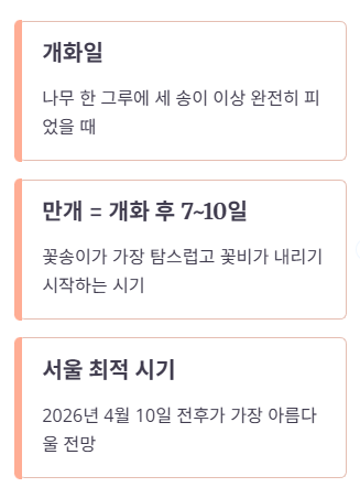 일반적으로 벚꽃은 개화일로부터 약 일주일 뒤에 가장 화려하게 피어나는 '만개' 상태가 됩니다. 2026년 주요 지역별 예상 일정을 아래 표로 확인해 보세요.