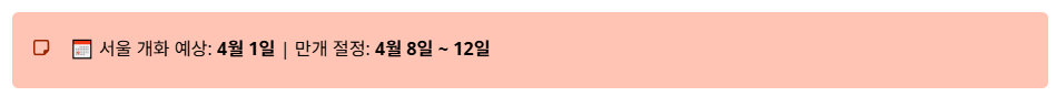수도권에 거주하신다면 서울의 벚꽃 명소를 빼놓을 수 없겠죠? 올해 서울의 벚꽃 개화는 4월 1일경으로 예상되며, 만개 시기는 4월 8일부터 12일 사이가 될 것으로 보입니다.