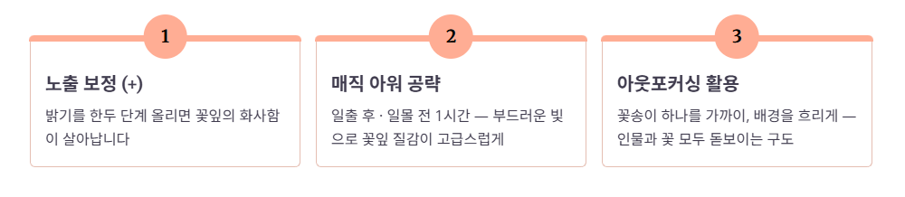 - 매직 아워 공략: 해가 지기 1시간 전이나 해가 뜨고 난 직후의 부드러운 빛을 활용하세요. 꽃잎의 질감이 훨씬 고급스럽게 표현됩니다.