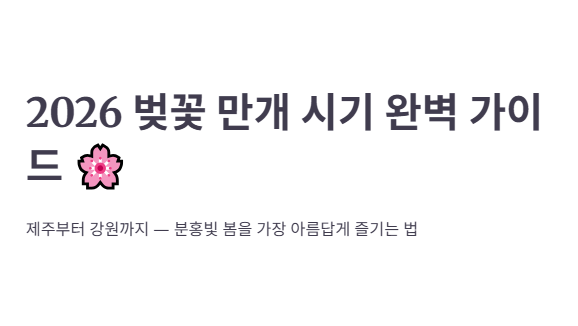 2026년 벚꽃은 제주(3월 20일)를 시작으로 서울은 4월 초에 개화하며, 전국적인 만개 시기는 3월 말에서 4월 중순 사이에 집중될 예정입니다. 이 시기를 놓치지 않도록 지금 바로 달력에 나들이 날짜를 체크하고 소중한 사람과 함께할 준비를 시작해 보세요!