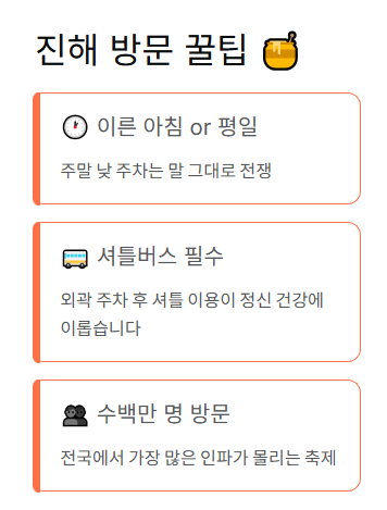- 방문 꿀팁: 전국에서 수백만 명이 모이는 축제인 만큼 주말 낮 시간대 주차는 말 그대로 전쟁입니다. 가급적 이른 아침이나 평일에 방문하시는 것을 추천하며, 외곽 주차장에 차를 대고 셔틀버스를 이용하는 것이 정신 건강에 좋습니다.