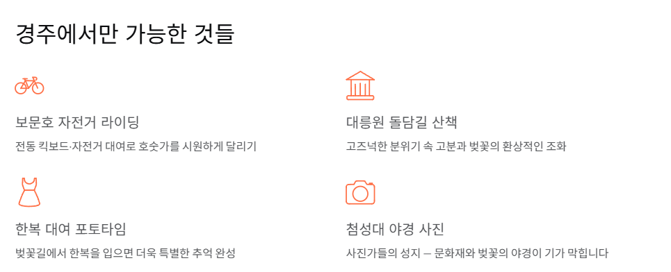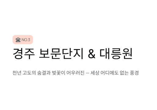 - 방문 꿀팁: 황리단길 인근에 예쁜 카페와 맛집이 많아 눈과 입이 모두 즐거운 여행이 가능합니다. 다만 벚꽃 시즌 황리단길 주변은 차량 정체가 심하므로, 숙소를 보문단지 쪽으로 잡고 이동하거나 대중교통을 활용하세요.