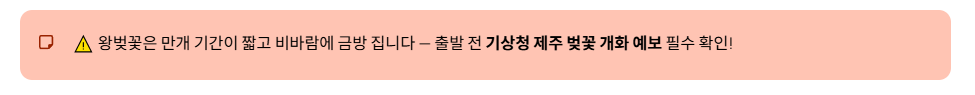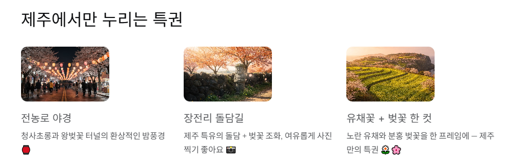 - 방문 꿀팁: 제주의 왕벚꽃은 개화 후 만개하기까지의 기간이 짧고, 비바람이 불면 금방 떨어지기 때문에 개화 시기 체크가 필수입니다. 비행기 표를 끊기 전 기상청의 제주 벚꽃 개화 예보를 반드시 확인하세요.