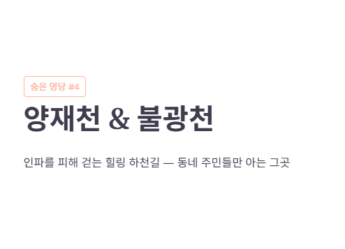 유명 명소의 사람 물결에 지쳤다면 동네 주민들만 아는 숨은 하천길로 눈을 돌려보세요. 양재천과 불광천은 산책로가 잘 정비되어 있어 걷기만 해도 힐링이 됩니다.