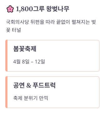 여의도 윤중로는 약 1,800그루의 왕벚나무가 국회의사당 뒤편을 따라 끝없이 펼쳐져 장관을 이룹니다. 한강의 시원한 바람을 맞으며 걷는 기분은 말로 다 표현하기 힘들 정도죠. 2026년 여의도 봄꽃축제는 4월 8일부터 12일까지 열릴 예정이니 공연과 푸드트럭을 함께 즐겨보세요.