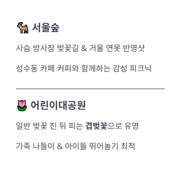 어린이대공원은 가족 단위 나들이객에게 안성맞춤입니다. 일반 벚꽃이 질 무렵에는 분홍빛이 더 짙은 '겹벚꽃'이 피어나기로 유명한데요. 공원이 넓어 자리를 잘 잡으면 비교적 한적하게 피크닉을 즐길 수 있고, 아이들이 뛰어놀기에도 최적의 장소입니다.