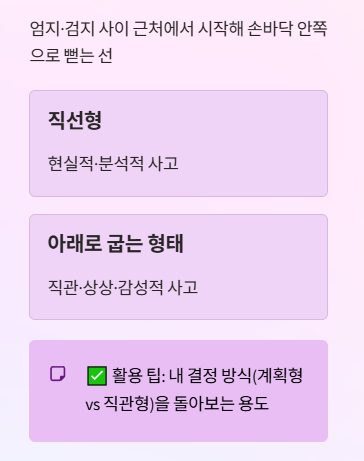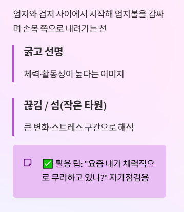 - 위치: 엄지·검지 사이 근처에서 시작해 손바닥 안쪽으로 뻗는 선