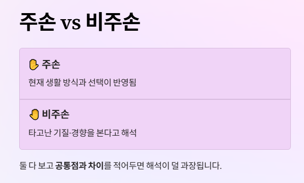- 주손(자주 쓰는 손): 현재의 생활 방식/선택이 더 잘 반영된다고들 봅니다.