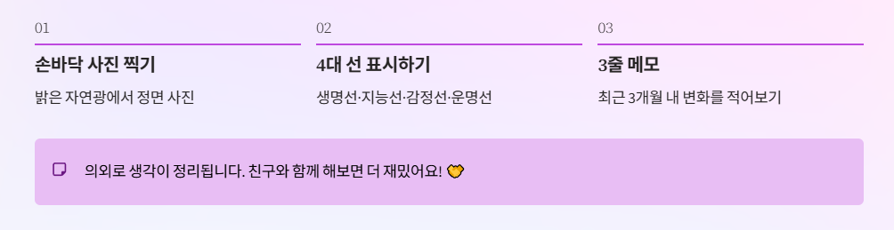 오늘 바로 해보세요: 손바닥 사진을 찍고, ①생명선 ②지능선 ③감정선 ④운명선만 표시한 뒤 “최근 3개월 내 변화”를 3줄로 적어보면 의외로 정리가 됩니다.