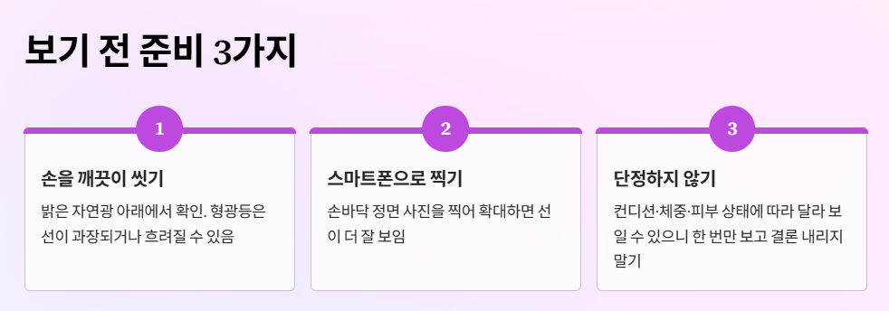 - 손금은 컨디션, 체중 변화, 피부 상태로도 달라 보일 수 있어요. 한 번 보고 단정하지 마세요.