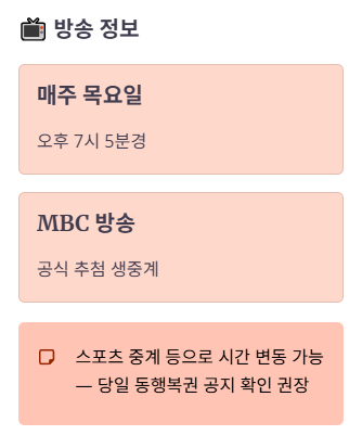 A. 공식 가이드 기준으로 매주 목요일 19:05경 MBC로 안내됩니다. 단, 특별 편성으로 변동 공지가 나올 수 있어요.