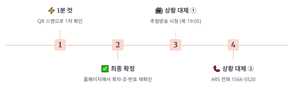 • QR 스캔은 편하지만, 카메라 인식이 흔들리거나 조명이 나쁘면 앱이 오동작하는 경우가 있습니다. 1) QR로 1차 확인 → 2) 동행복권 홈페이지에서 회차번호/조/6자리 재대조 이 순서를 추천합니다.