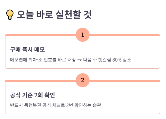 오늘 산 복권이 있다면, 메모앱에 “구매 회차/조/번호”를 바로 적어두세요. 다음 주에 확인할 때 헷갈림이 80% 줄어듭니다. 그리고 확인은 꼭 동행복권(공식) 기준으로 2번 하세요.