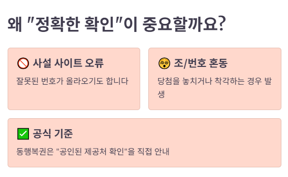 A. 동행복권 홈페이지(추첨결과) 기준이 가장 안전합니다. 동행복권도 “공인된 제공처인지 확인”을 강조해요.