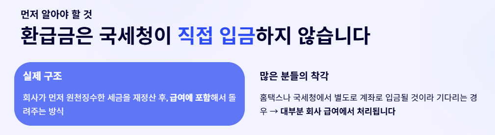 근데 여기서 많이들 착각하는 포인트가 하나 있습니다. 연말정산 환급금은 ‘국세청이 바로 입금’해주는 돈이 아니라, 대부분 ‘회사 급여’에서 먼저 정산돼서 들어오는 구조라는 거예요. (회사에서 원천징수한 세금을 다시 맞춰서 돌려주는 방식)