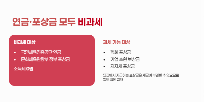 국가에서 주는 연금과 정부 포상금은 소득세 비과세입니다. 국민체육진흥공단이 지급하는 연금도 비과세 대상이며, 문화체육관광부에서 주는 정부 포상금 역시 과세 대상이 아닙니다. 다만 협회·기업·지자체 등 민간 포상금은 과세 대상일 수 있습니다.