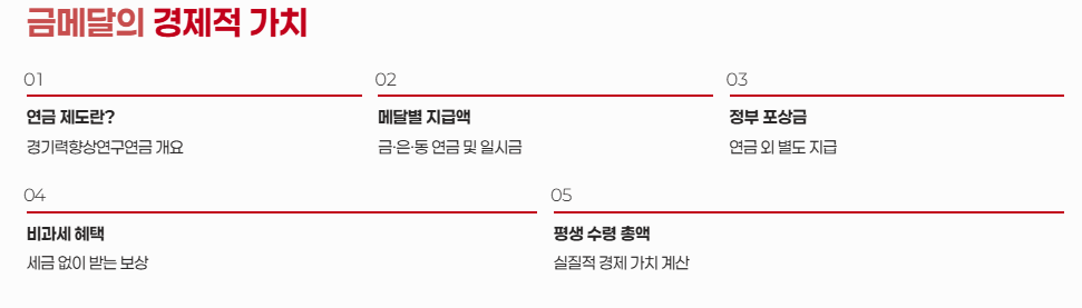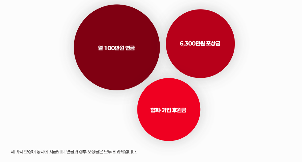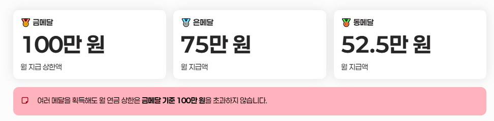 ※ 예를 들어 금메달 1개를 따면 월 100만 원 연금 + 6,300만 원 정부 포상금을 받게 됩니다.