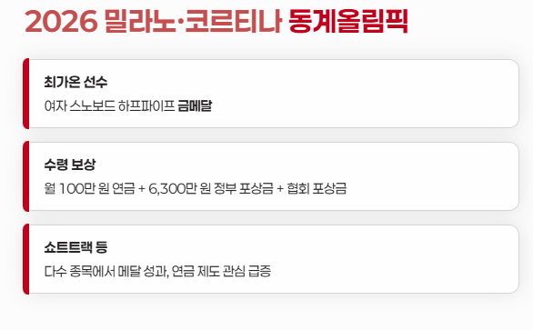 최근 2024년 파리 하계올림픽에서 한국 선수들은 여러 종목에서 메달 성과를 냈고, 2026년 밀라노·코르티나 동계올림픽에서도 스노보드, 쇼트트랙 등에서 메달이 이어지고 있습니다. 예를 들어 2026년 밀라노·코르티나 동계올림픽에서 여자 스노보드 하프파이프 금메달리스트 최가온 선수는 정부 포상금과 협회 보상금, 그리고 연금 시스템의 혜택을 동시에 받게 되었습니다.