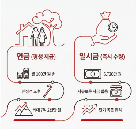 일시금 선택 시 연금처럼 평생 지급되는 것이 아니라 한 번에 지급하는 보상입니다.