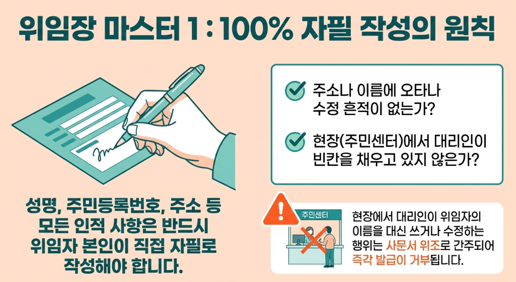 첫째, 모든 내용은 위임자가 직접 자필로 작성하는 것이 원칙입니다. 특히 성명, 주민등록번호, 주소 등 인적 사항에 오타가 없어야 합니다.