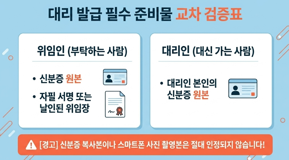 본인이 바빠서 가족이나 지인을 대신 보내야 할 때, 준비물은 조금 더 까다로워집니다. 대리 발급 시 가장 빈번하게 발생하는 실수가 바로 '위임장' 작성입니다. 우선 대리인의 신분증과 위임인의 신분증(원본) 이 모두 필요합니다. 복사본이나 사진 촬영본은 인정되지 않으니 주의해야 합니다.