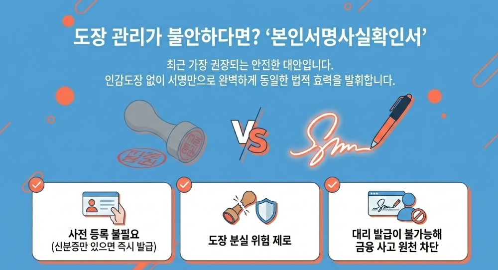 또한, 최근에는 인감증명서 대신 '본인서명사실확인서'를 권장하는 추세입니다. 이는 도장 없이 서명만으로 인감과 동일한 효력을 내는 문서로, 사전에 등록할 필요 없이 신분증만 있으면 즉시 발급 가능합니다. 인감도장을 관리하기 번거롭거나 분실 위험이 걱정된다면 이 제도를 활용해 보는 것도 좋은 대안이 될 것입니다.