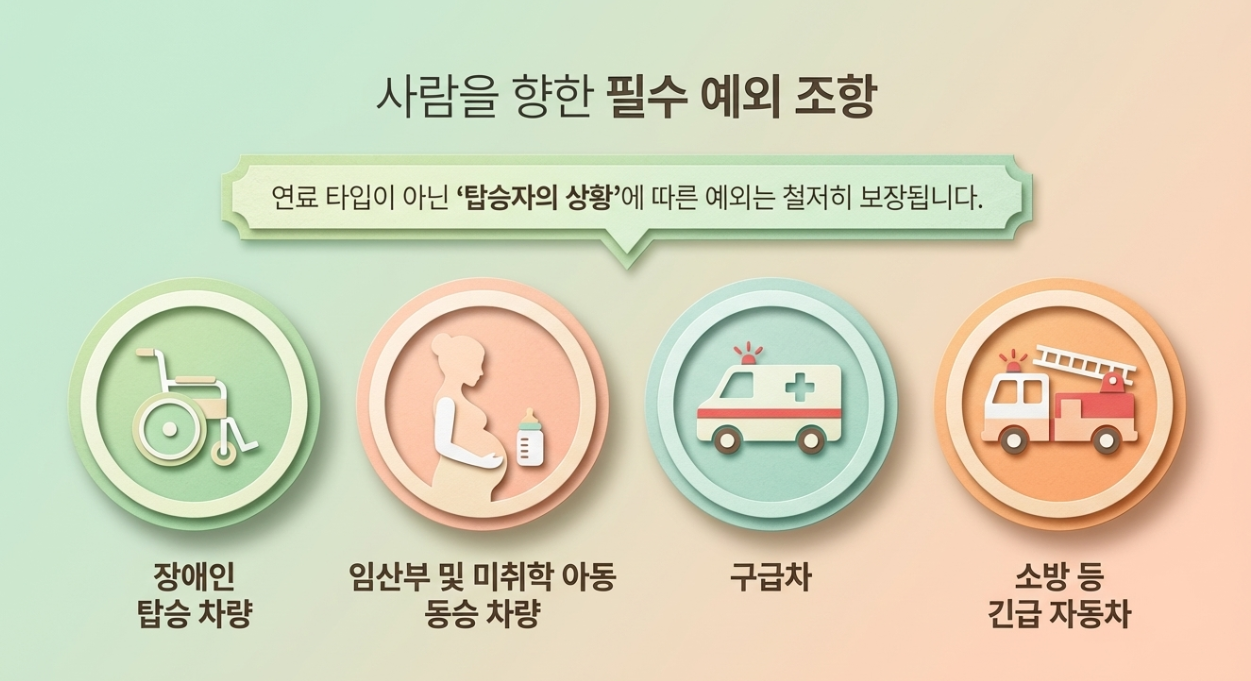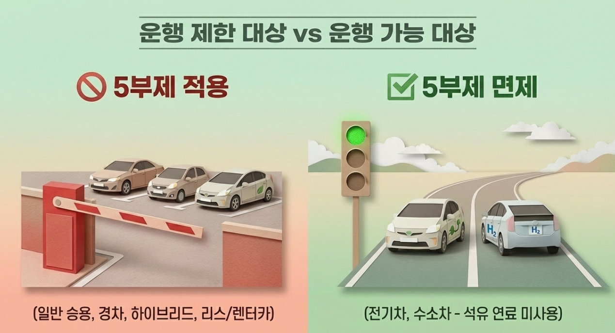 • 제외 대상 (운행 가능): 전기차수소차는 석유 연료를 직접 사용하지 않으므로 이번에도 적용 대상에서 빠졌습니다. 또한 장애인 탑승 차량, 임산부 및 미취학 아동 동승 차량, 긴급 자동차(구급·소방 등)는 예외로 인정받아 자유롭게 운행할 수 있습니다.