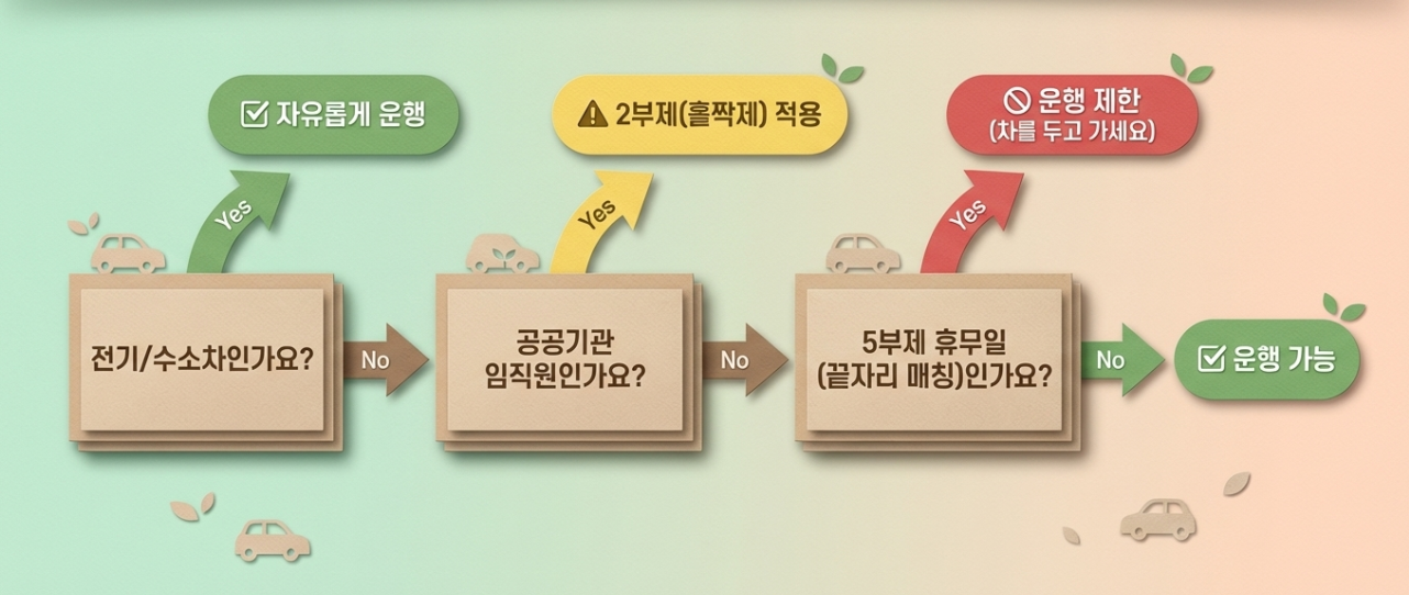 2026년 5부제는 경차·하이브리드를 포함하며 전기·수소차는 제외되니, 요일별 끝번호를 확인해 공공기관 이용 시 불이익을 받지 않도록 주의하세요.