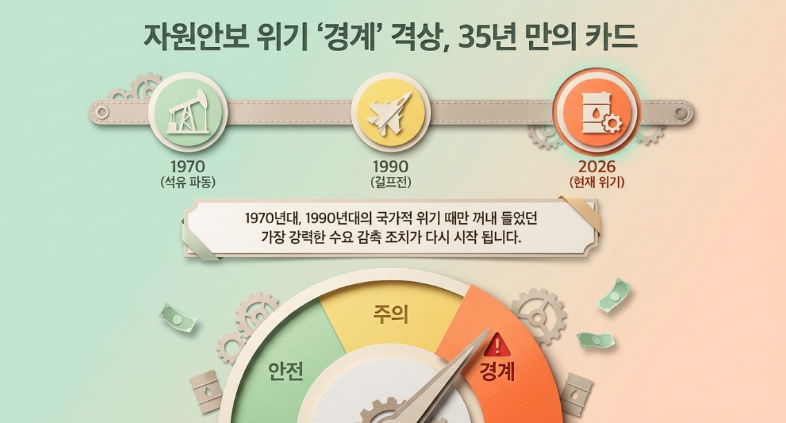최근 이란과 이스라엘 간의 전쟁 등 중동 사태가 장기화되면서 국제 유가가 배럴당 100달러를 돌파하는 등 에너지 수급에 비상이 걸렸습니다. 정부는 이에 대응하여 자원안보 위기 단계를 '주의' 에서 '경계' 단계로 격상했습니다.