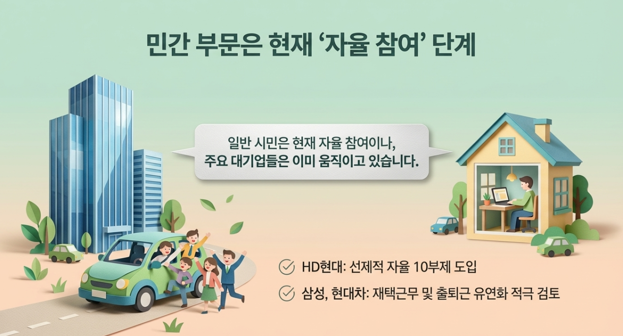 현재 일반 시민들의 민간 차량은 '자율 참여' 단계입니다. 대중교통을 이용하거나 카풀을 하는 방식으로 동참을 유도하고 있죠. 하지만 중동 전쟁이 더 격화되어 위기 단계가 '심각' 으로 올라가면 민간 차량 5부제도 강제로 시행될 수 있습니다. 기업들도 이에 선제적으로 대응하고 있습니다. HD현대는 이미 자율적 10부제를 도입했고, 삼성이나 현대차 등 주요 대기업들도 재택근무나 출퇴근 시간 조정을 검토하며 에너지 절감에 힘을 보태고 있습니다.