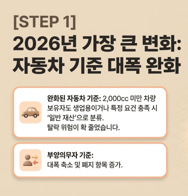 ​여기서 중요한 점은 단순히 월급만이 기준이 아니라는 것입니다. '소득인정액'은 실제 소득에 재산을 소득으로 환산한 금액을 더해 계산합니다. 특히 2026년부터는 자동차 기준이 크게 완화되어, 2,000cc 미만의 차량을 보유하고 있더라도 생업용이거나 일정 요건을 충족하면 일반 재산으로 분류되어 탈락 위험이 줄어들었습니다. 소득이 기준보다 조금 높더라도 근로소득 공제(70% 적용 등)를 받으면 대상이 될 수 있으니 미리 포기하지 마세요.