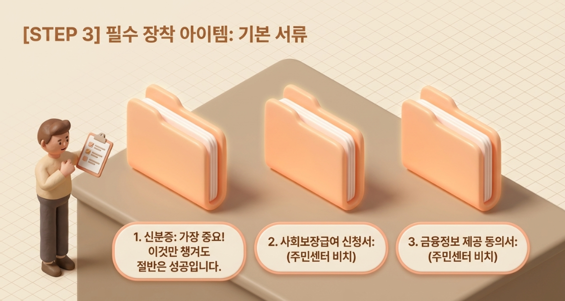 서류가 미비하면 심사 기간이 길어질 수 있습니다. 방문 전 다음의 서류를 미리 체크해 보세요. 기본적으로 사회보장급여 신청서, 금융정보 제공 동의서, 신분증이 필요합니다. 주민센터에 비치되어 있으므로 신분증만 잘 챙겨가도 절반은 성공입니다.