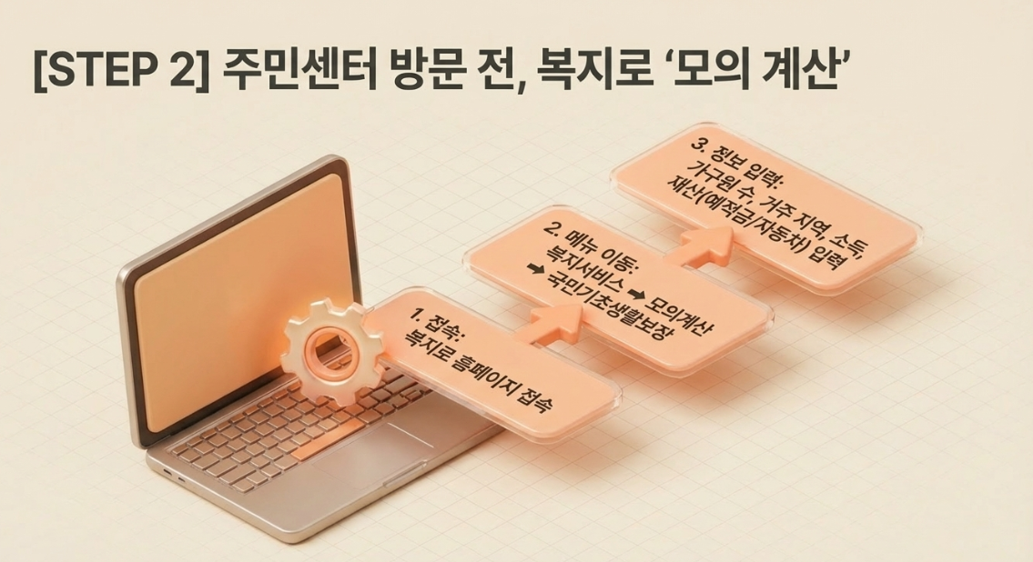 주민센터를 가기 전, 집에서 가장 먼저 해볼 수 있는 방법은 '복지로' 홈페이지의 모의 계산기입니다. 이 서비스는 본인이 직접 입력한 정보를 바탕으로 지원 가능 여부를 알려주기 때문에 매우 유용합니다.