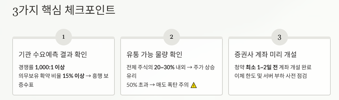 - 기관 수요예측 결과 확인: 기관 투자자들이 얼마나 줄을 섰는지가 흥행의 척도입니다. 보통 경쟁률 1,000:1 이상, 의무보유 확약 비율 15% 이상이면 '흥행 보증수표'로 통합니다.
