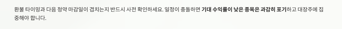 - 이자 비용 계산: 마이너스 통장 등을 활용할 경우, 2~3일간의 이자 비용보다 예상 수익이 훨씬 크다고 판단될 때만 레버리지를 활용하시기 바랍니다.