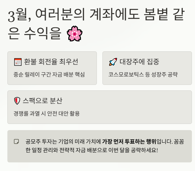 공모주 투자는 단순히 주 을 사는 것이 아니라, 기업의 미래 가치에 가장 먼저 투표하는 멋진 행위입니다. 꼼꼼한 일정 관리와 전략적인 자금 배분으로 이번 3월, 여러분의 계좌에도 따스한 봄볕과 같은 수익이 가득하시길 진심으로 응원합니다!