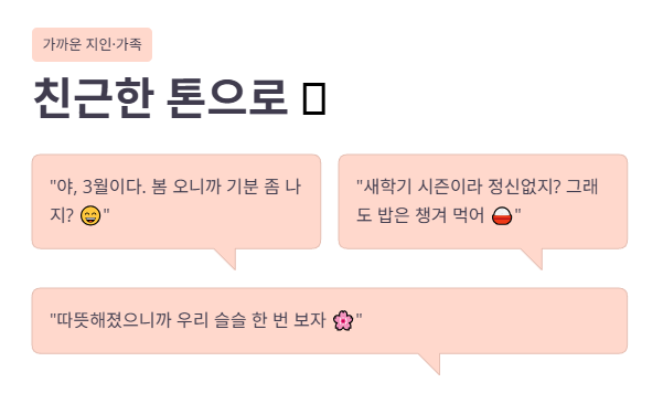 → “적응”, “컨디션”, “페이스”, “새출발” 같은 3월 키워드를 섞어주세요. - 상대 상황을 1초라도 떠올리면 문장이 살아납니다.
