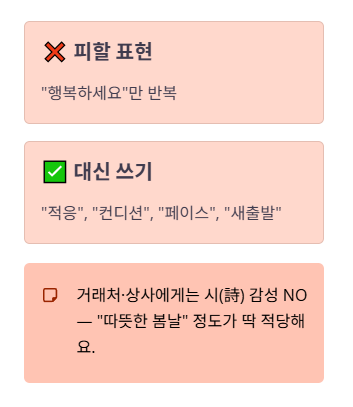 → 거래처/상사에게는 “따뜻한 봄날” 정도까지만. 시(詩) 느낌은 호불호가 커요.